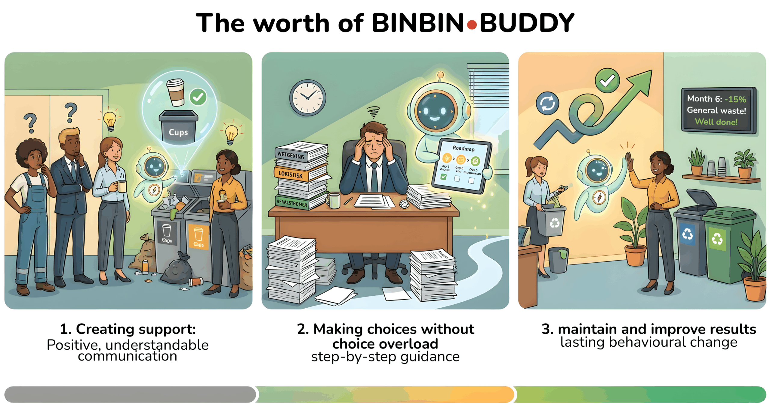 Behavioural change and support are just as important as the system itself. The BINBINBUDDY helps you to: