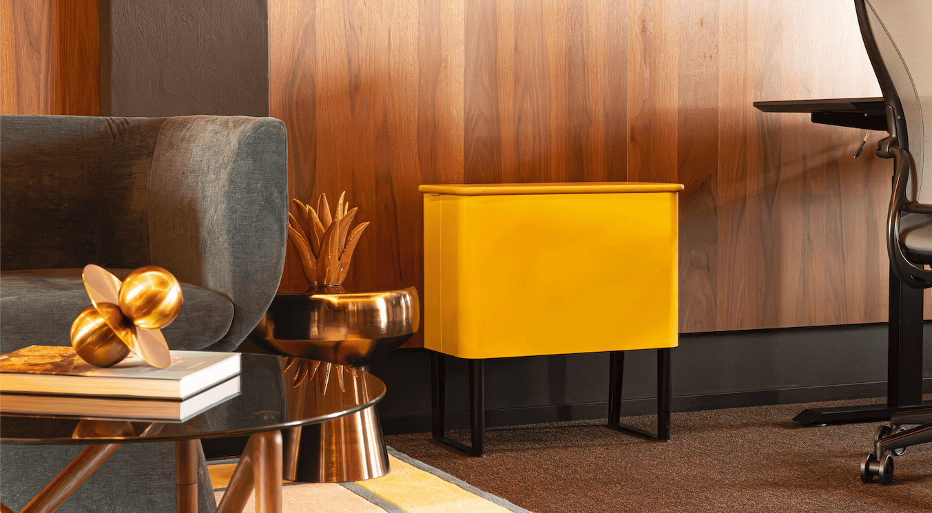 Il BINBIN Home è un contenitore circolare al 100%. Realizzato interamente con materiali riciclati e circolari, il corpo è costruito in acciaio riciclato e il coperchio in MDF riciclato colorato.