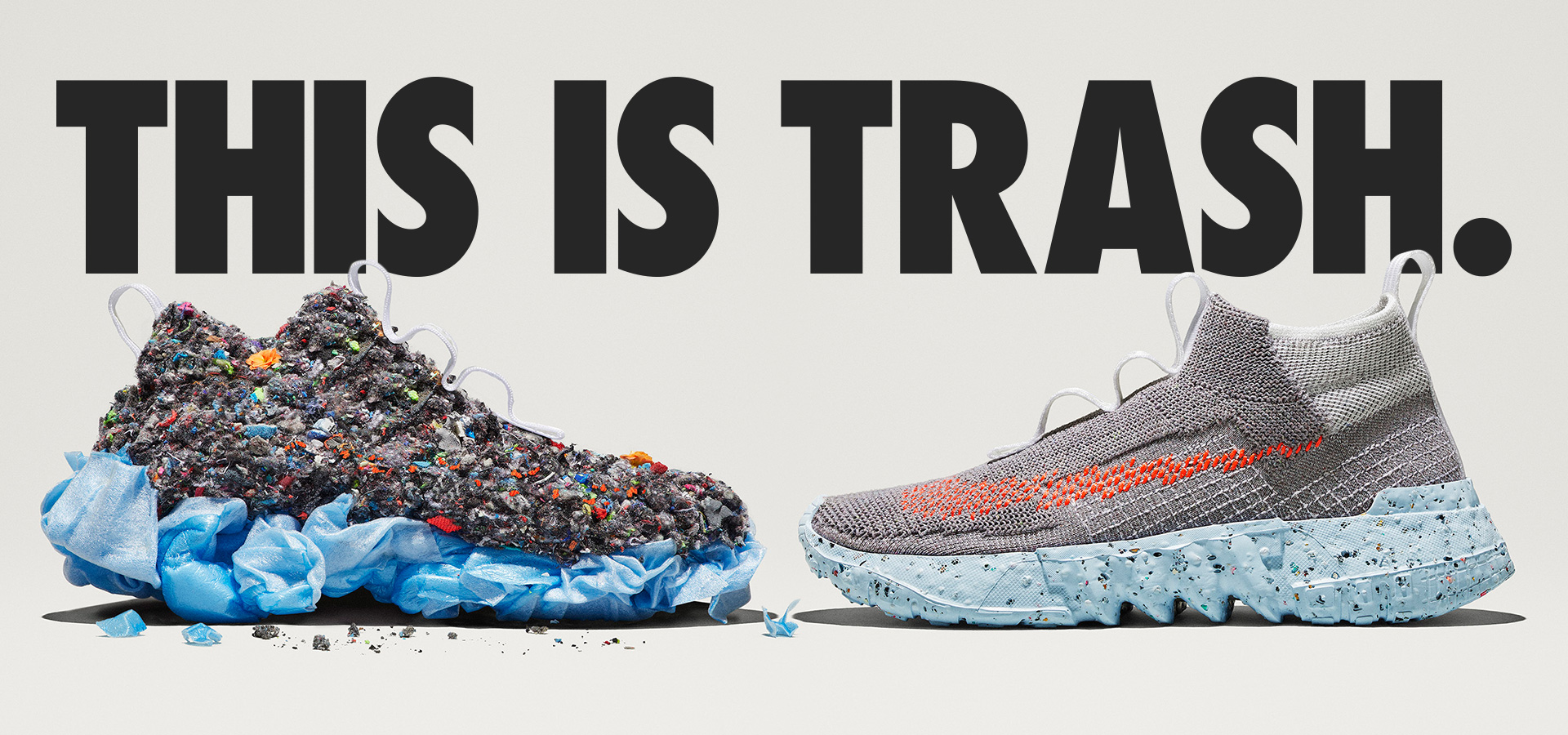 Nike is een bekend schoenen- en sportmerk. Op deze pagina richten we ons op hun collectie Space Hippie en hun zusterbedrijf Nike Grind. Deze bedrijven slopen oude Nike schoenen en maken er nieuwe materialen van.