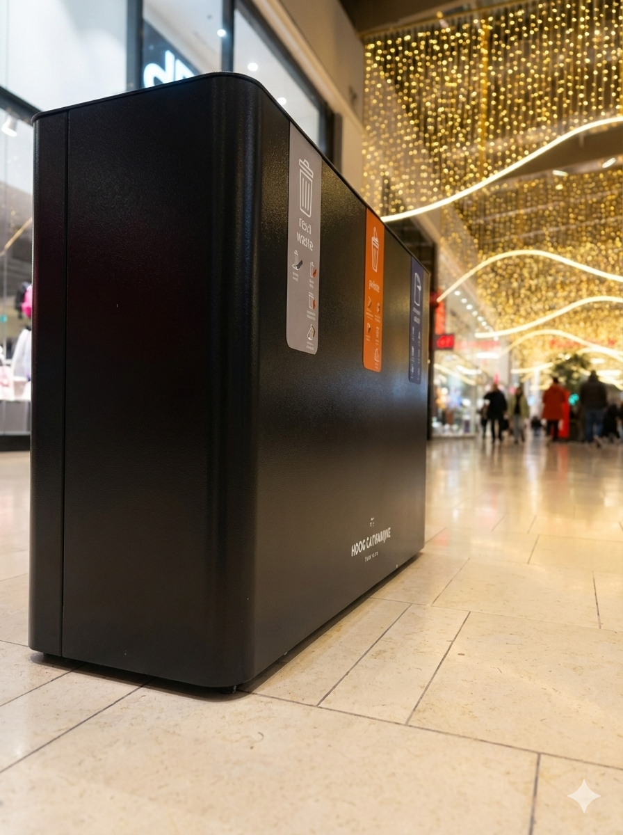 Os caixotes do lixo não só criam um ambiente mais limpo, como também contribuem para a sensação de calma e qualidade dentro do centro comercial movimentado.
